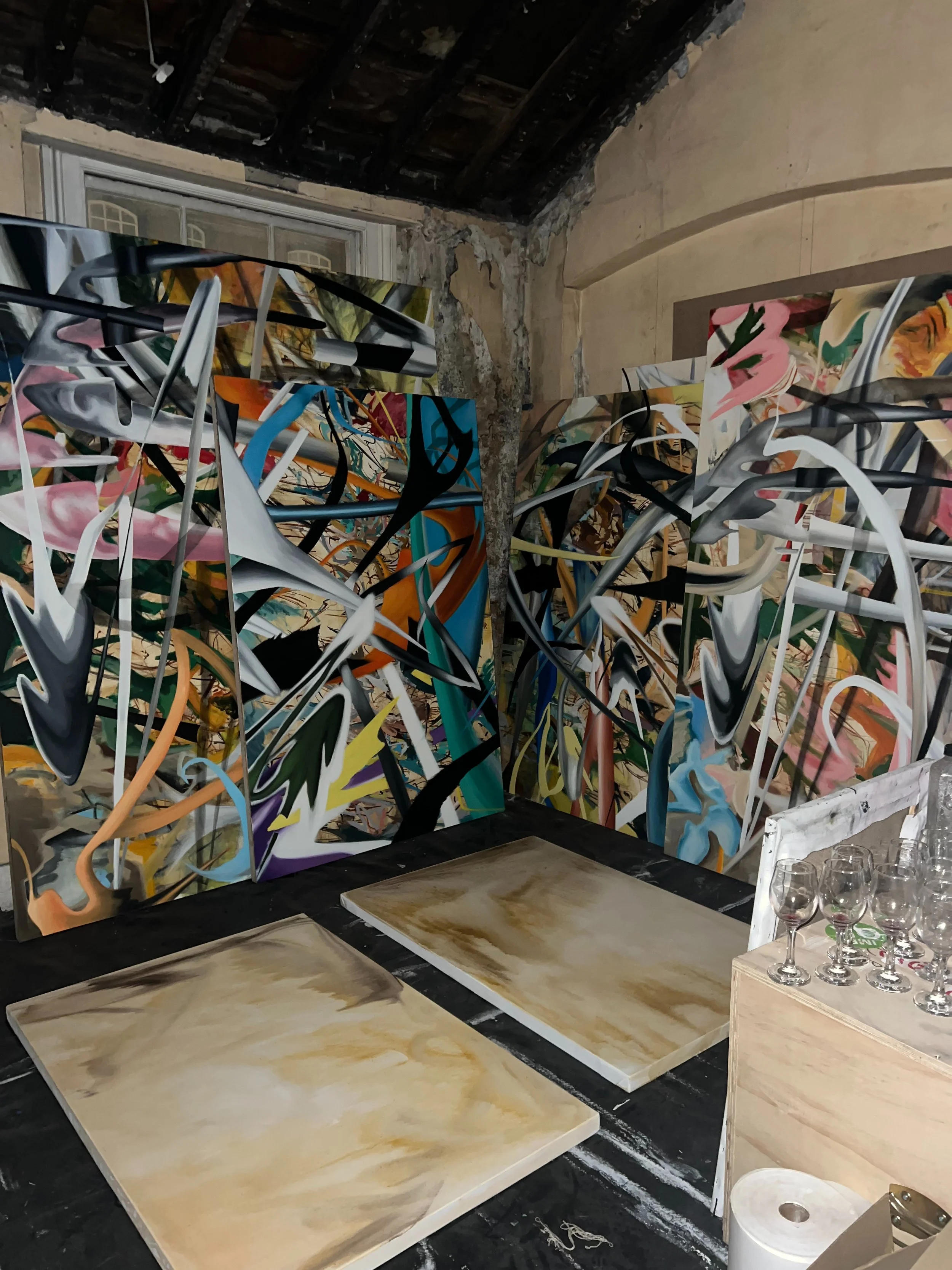 His process balances control and intuition, treating creation as a form of surrender. By trusting intuition, Julian allows distortion in form and thought to emerge, using painting to access what resists language. This exchange with the unknowable functions as an ongoing meditation, revealing moments where perception and belief quietly fracture.
