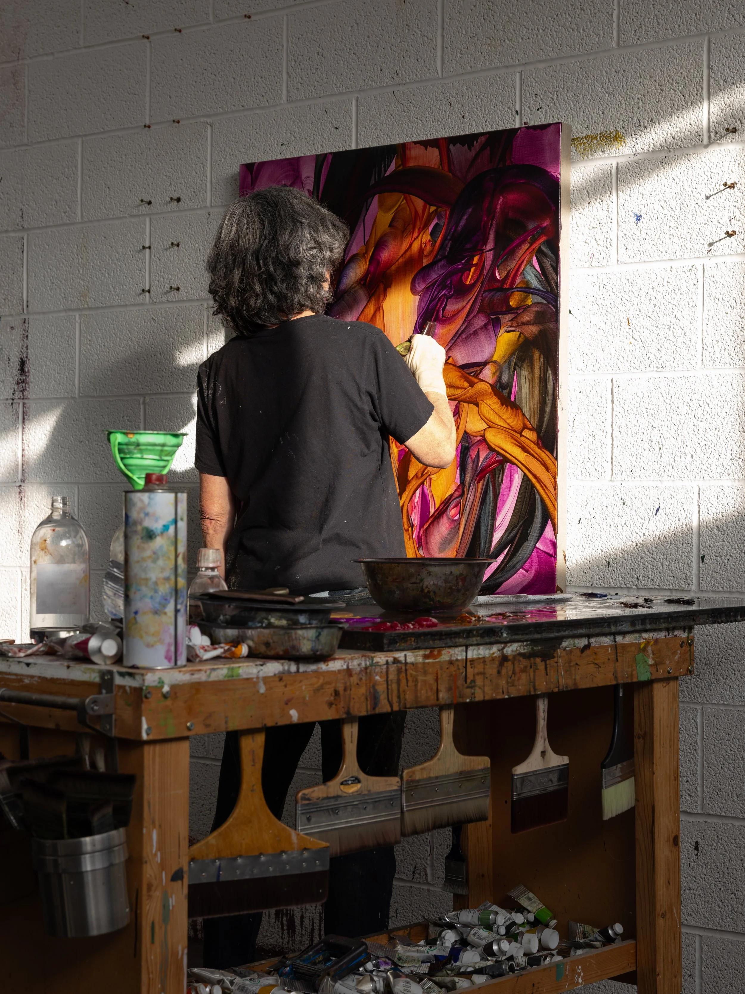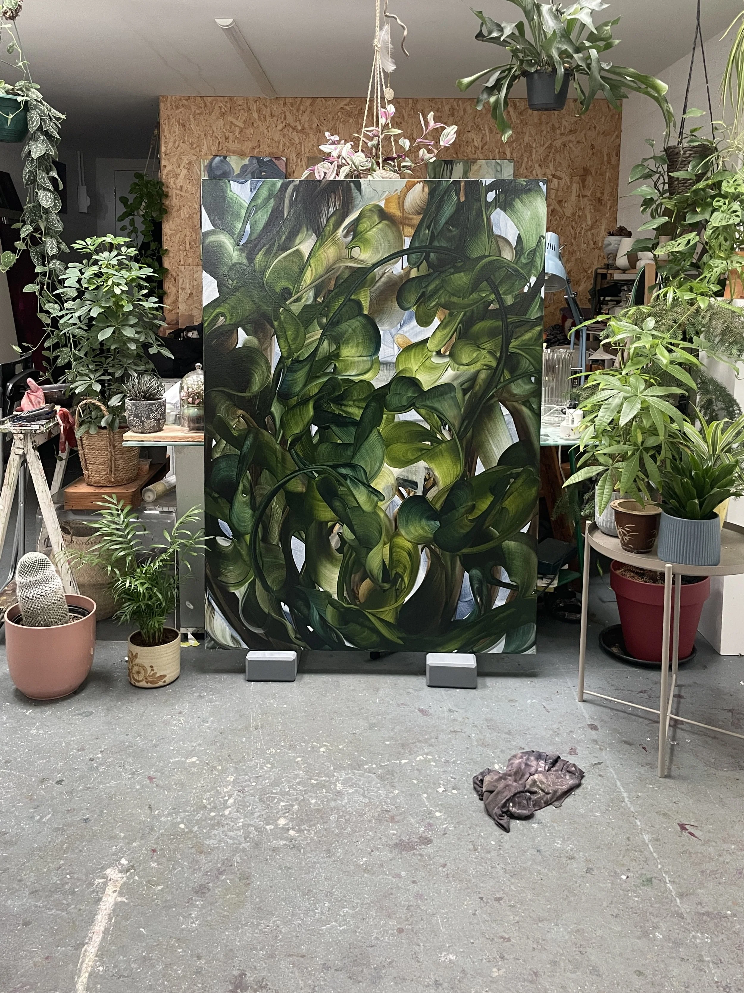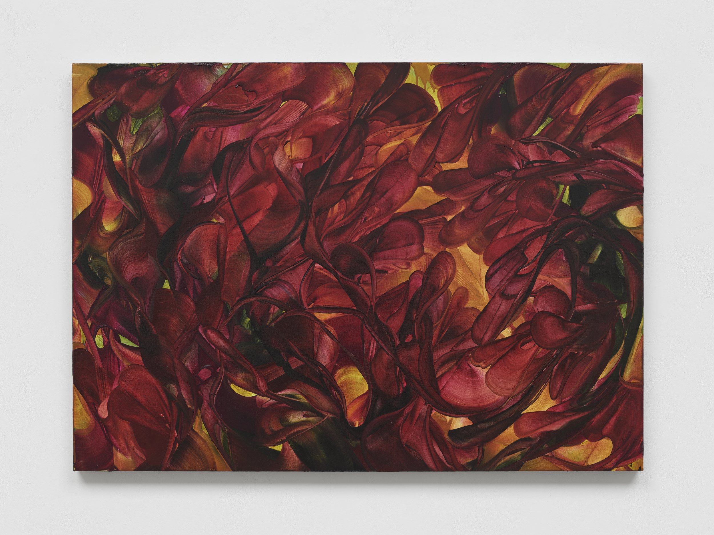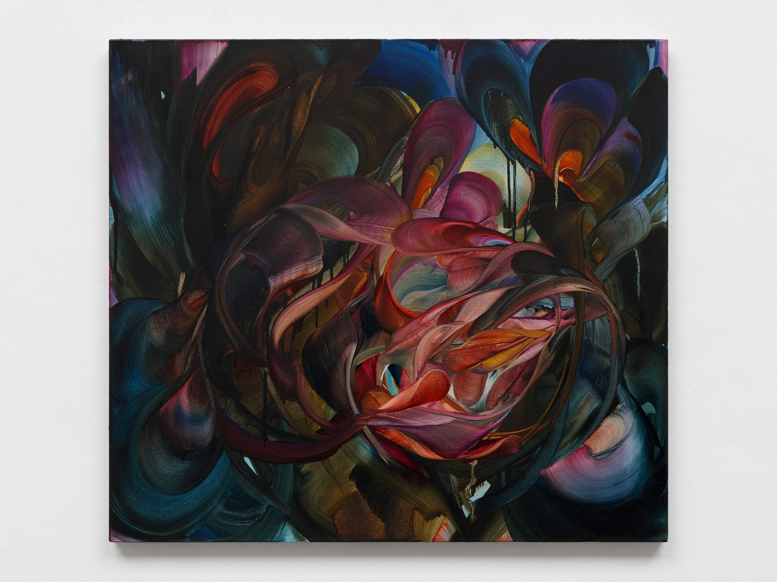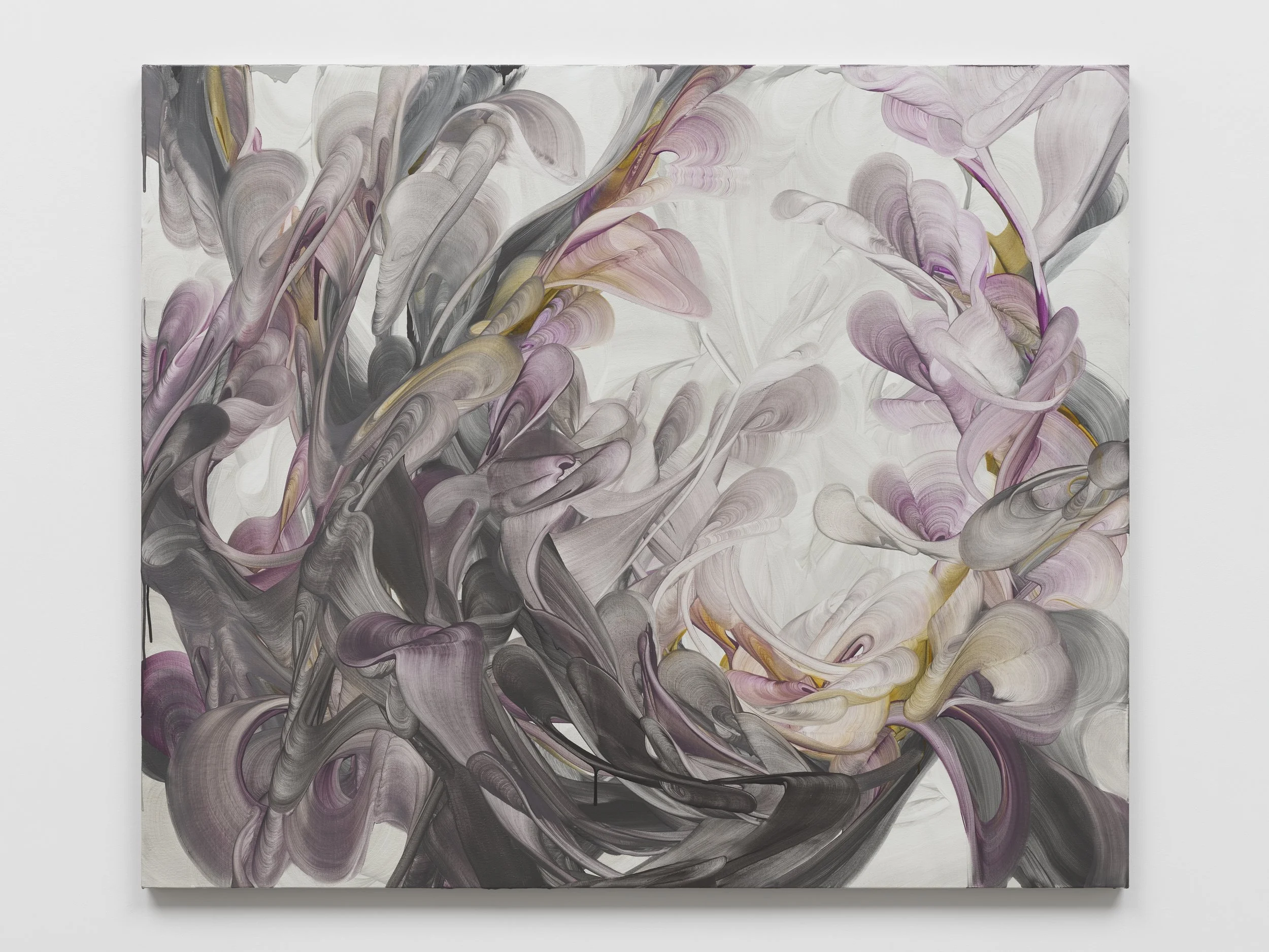 Michele Fletcher approaches painting as a continuous state of becoming rather than the depiction of fixed forms. Growth and expansion emerge through accumulation, one gesture prompting the next, forms branching almost autonomously and she is most drawn to the moment where control gives way to something more organic. Long, intensive sessions of scraping, dragging, and reworking leave their mark both bodily and psychologically, and Fletcher treats this as inseparable from the paintings themselves.